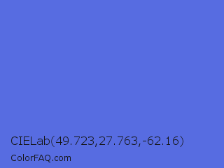 CIELab 49.723,27.763,-62.16 Color is a light blue color and the nearest color is Royal Blue #4169e1. Hex code #576ce1 and RGB value is rgb(87,108,225). In RGB color space, this color is composed of 34% red, 42% green, 88% blue, In CMYK color space, this color is composed of 61% cyan, 52% magenta, 0% yellow , 12% black , In HSL color space, this color has a hue angle of 231° , 70% saturation and 61% lightness.