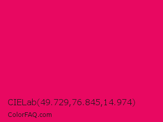 CIELab 49.729,76.845,14.974 Color is a normal rose color and the nearest color is Raspberry #e30b5d. Hex code #e80861 and RGB value is rgb(232,8,97). In RGB color space, this color is composed of 91% red, 3% green, 38% blue, In CMYK color space, this color is composed of 0% cyan, 97% magenta, 58% yellow , 9% black , In HSL color space, this color has a hue angle of 336° , 93% saturation and 47% lightness.
