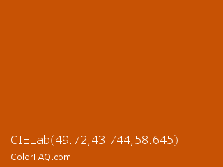CIELab 49.72,43.744,58.645 Color is a normal orange color and the nearest color is Burnt Orange #cc5500. Hex code #c75204 and RGB value is rgb(199,82,4). In RGB color space, this color is composed of 78% red, 32% green, 2% blue, In CMYK color space, this color is composed of 0% cyan, 59% magenta, 98% yellow , 22% black , In HSL color space, this color has a hue angle of 24° , 96% saturation and 40% lightness.