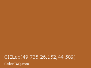 CIELab 49.735,26.152,44.589 Color is a normal orange color and the nearest color is Desert #ae6020. Hex code #af6329 and RGB value is rgb(175,99,41). In RGB color space, this color is composed of 69% red, 39% green, 16% blue, In CMYK color space, this color is composed of 0% cyan, 43% magenta, 77% yellow , 31% black , In HSL color space, this color has a hue angle of 26° , 62% saturation and 42% lightness.
