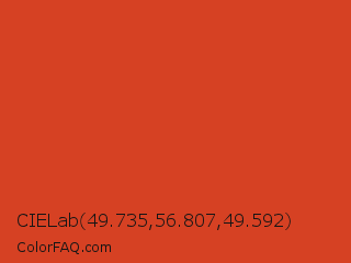 CIELab 49.735,56.807,49.592 Color is a normal red color and the nearest color is Vermilion #d9381e. Hex code #d64123 and RGB value is rgb(214,65,35). In RGB color space, this color is composed of 84% red, 25% green, 14% blue, In CMYK color space, this color is composed of 0% cyan, 70% magenta, 84% yellow , 16% black , In HSL color space, this color has a hue angle of 10° , 72% saturation and 49% lightness.