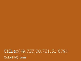 CIELab 49.737,30.731,51.679 Color is a normal orange color and the nearest color is Light Brown #b5651d. Hex code #b65f19 and RGB value is rgb(182,95,25). In RGB color space, this color is composed of 71% red, 37% green, 10% blue, In CMYK color space, this color is composed of 0% cyan, 48% magenta, 86% yellow , 29% black , In HSL color space, this color has a hue angle of 27° , 76% saturation and 41% lightness.