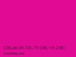 CIELab 49.741,79.048,-16.248 Color is a normal magenta color and the nearest color is Barbie Pink #e0218a. Hex code #e00a94 and RGB value is rgb(224,10,148). In RGB color space, this color is composed of 88% red, 4% green, 58% blue, In CMYK color space, this color is composed of 0% cyan, 96% magenta, 34% yellow , 12% black , In HSL color space, this color has a hue angle of 321° , 91% saturation and 46% lightness.