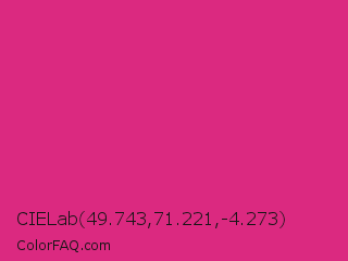 CIELab 49.743,71.221,-4.273 Color is a normal rose color and the nearest color is Cerise #da3287. Hex code #db2980 and RGB value is rgb(219,41,128). In RGB color space, this color is composed of 86% red, 16% green, 50% blue, In CMYK color space, this color is composed of 0% cyan, 81% magenta, 42% yellow , 14% black , In HSL color space, this color has a hue angle of 331° , 71% saturation and 51% lightness.