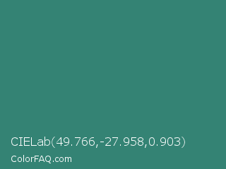 CIELab 49.766,-27.958,0.903 Color is a normal cyan color and the nearest color is Celadon Green #2f847c. Hex code #348374 and RGB value is rgb(52,131,116). In RGB color space, this color is composed of 20% red, 51% green, 45% blue, In CMYK color space, this color is composed of 60% cyan, 0% magenta, 11% yellow , 49% black , In HSL color space, this color has a hue angle of 169° , 43% saturation and 36% lightness.