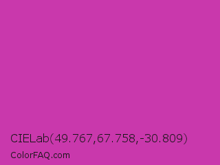 CIELab 49.767,67.758,-30.809 Color is a normal magenta color and the nearest color is Byzantine #bd33a4. Hex code #c938ac and RGB value is rgb(201,56,172). In RGB color space, this color is composed of 79% red, 22% green, 67% blue, In CMYK color space, this color is composed of 0% cyan, 72% magenta, 14% yellow , 21% black , In HSL color space, this color has a hue angle of 312° , 57% saturation and 50% lightness.