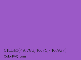 CIELab 49.782,46.75,-46.927 Color is a normal purple color and the nearest color is Deep Lilac #9955bb. Hex code #9b59c7 and RGB value is rgb(155,89,199). In RGB color space, this color is composed of 61% red, 35% green, 78% blue, In CMYK color space, this color is composed of 22% cyan, 55% magenta, 0% yellow , 22% black , In HSL color space, this color has a hue angle of 276° , 50% saturation and 56% lightness.
