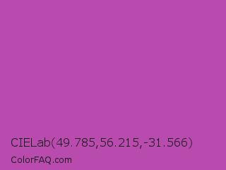 CIELab 49.785,56.215,-31.566 Color is a normal magenta color and the nearest color is Fuchsia Pink #c154c1. Hex code #b84bad and RGB value is rgb(184,75,173). In RGB color space, this color is composed of 72% red, 29% green, 68% blue, In CMYK color space, this color is composed of 0% cyan, 59% magenta, 6% yellow , 28% black , In HSL color space, this color has a hue angle of 306° , 43% saturation and 51% lightness.