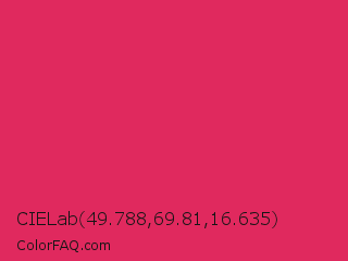 CIELab 49.788,69.81,16.635 Color is a normal rose color and the nearest color is Cerise Red #de3163. Hex code #e0295e and RGB value is rgb(224,41,94). In RGB color space, this color is composed of 88% red, 16% green, 37% blue, In CMYK color space, this color is composed of 0% cyan, 82% magenta, 58% yellow , 12% black , In HSL color space, this color has a hue angle of 343° , 75% saturation and 52% lightness.