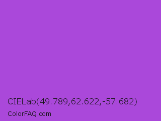 CIELab 49.789,62.622,-57.682 Color is a normal purple color and the nearest color is Medium Orchid #ba55d3. Hex code #aa48da and RGB value is rgb(170,72,218). In RGB color space, this color is composed of 67% red, 28% green, 85% blue, In CMYK color space, this color is composed of 22% cyan, 67% magenta, 0% yellow , 15% black , In HSL color space, this color has a hue angle of 280° , 66% saturation and 57% lightness.