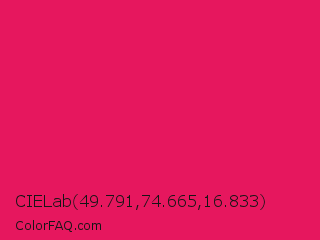 CIELab 49.791,74.665,16.833 Color is a normal rose color and the nearest color is Ruby #e0115f. Hex code #e6175e and RGB value is rgb(230,23,94). In RGB color space, this color is composed of 90% red, 9% green, 37% blue, In CMYK color space, this color is composed of 0% cyan, 90% magenta, 59% yellow , 10% black , In HSL color space, this color has a hue angle of 339° , 82% saturation and 50% lightness.