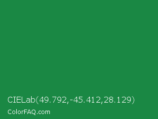 CIELab 49.792,-45.412,28.129 Color is a normal green color and the nearest color is Salem #097f4b. Hex code #1a8844 and RGB value is rgb(26,136,68). In RGB color space, this color is composed of 10% red, 53% green, 27% blue, In CMYK color space, this color is composed of 81% cyan, 0% magenta, 50% yellow , 47% black , In HSL color space, this color has a hue angle of 143° , 68% saturation and 32% lightness.