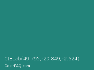 CIELab 49.795,-29.849,-2.624 Color is a normal cyan color and the nearest color is Elm #1c7c7d. Hex code #22847a and RGB value is rgb(34,132,122). In RGB color space, this color is composed of 13% red, 52% green, 48% blue, In CMYK color space, this color is composed of 74% cyan, 0% magenta, 8% yellow , 48% black , In HSL color space, this color has a hue angle of 174° , 59% saturation and 33% lightness.