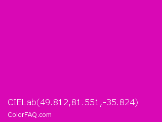 CIELab 49.812,81.551,-35.824 Color is a normal magenta color and the nearest color is Deep Magenta #cc00cc. Hex code #d908b5 and RGB value is rgb(217,8,181). In RGB color space, this color is composed of 85% red, 3% green, 71% blue, In CMYK color space, this color is composed of 0% cyan, 96% magenta, 17% yellow , 15% black , In HSL color space, this color has a hue angle of 310° , 93% saturation and 44% lightness.