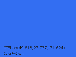 CIELab 49.818,27.737,-71.624 Color is a normal blue color and the nearest color is Ultramarine Blue #4166f5. Hex code #336ef2 and RGB value is rgb(51,110,242). In RGB color space, this color is composed of 20% red, 43% green, 95% blue, In CMYK color space, this color is composed of 79% cyan, 55% magenta, 0% yellow , 5% black , In HSL color space, this color has a hue angle of 221° , 88% saturation and 57% lightness.