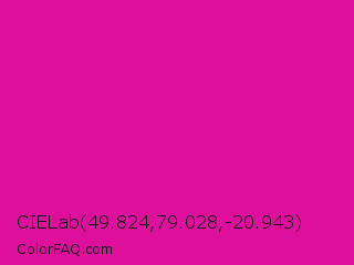 CIELab 49.824,79.028,-20.943 Color is a normal magenta color and the nearest color is Barbie Pink #e0218a. Hex code #de0f9c and RGB value is rgb(222,15,156). In RGB color space, this color is composed of 87% red, 6% green, 61% blue, In CMYK color space, this color is composed of 0% cyan, 93% magenta, 30% yellow , 13% black , In HSL color space, this color has a hue angle of 319° , 87% saturation and 46% lightness.