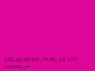 CIELab 49.831,79.86,-19.107 Color is a normal magenta color and the nearest color is Hollywood Cerise #f400a1. Hex code #e00699 and RGB value is rgb(224,6,153). In RGB color space, this color is composed of 88% red, 2% green, 60% blue, In CMYK color space, this color is composed of 0% cyan, 97% magenta, 32% yellow , 12% black , In HSL color space, this color has a hue angle of 320° , 95% saturation and 45% lightness.