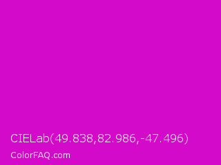 CIELab 49.838,82.986,-47.496 Color is a normal magenta color and the nearest color is Deep Magenta #cc00cc. Hex code #d30ac9 and RGB value is rgb(211,10,201). In RGB color space, this color is composed of 83% red, 4% green, 79% blue, In CMYK color space, this color is composed of 0% cyan, 95% magenta, 5% yellow , 17% black , In HSL color space, this color has a hue angle of 303° , 91% saturation and 43% lightness.