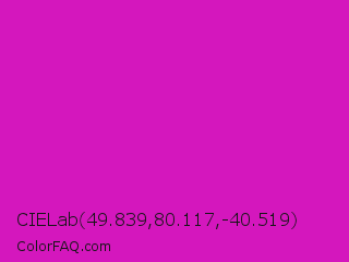 CIELab 49.839,80.117,-40.519 Color is a normal magenta color and the nearest color is Deep Magenta #cc00cc. Hex code #d417bd and RGB value is rgb(212,23,189). In RGB color space, this color is composed of 83% red, 9% green, 74% blue, In CMYK color space, this color is composed of 0% cyan, 89% magenta, 11% yellow , 17% black , In HSL color space, this color has a hue angle of 307° , 80% saturation and 46% lightness.