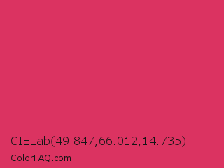 CIELab 49.847,66.012,14.735 Color is a normal rose color and the nearest color is Cerise Red #de3163. Hex code #db3361 and RGB value is rgb(219,51,97). In RGB color space, this color is composed of 86% red, 20% green, 38% blue, In CMYK color space, this color is composed of 0% cyan, 77% magenta, 56% yellow , 14% black , In HSL color space, this color has a hue angle of 344° , 70% saturation and 53% lightness.