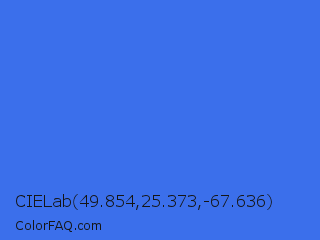 CIELab 49.854,25.373,-67.636 Color is a normal blue color and the nearest color is Royal Blue #4169e1. Hex code #3b6feb and RGB value is rgb(59,111,235). In RGB color space, this color is composed of 23% red, 44% green, 92% blue, In CMYK color space, this color is composed of 75% cyan, 53% magenta, 0% yellow , 8% black , In HSL color space, this color has a hue angle of 222° , 81% saturation and 58% lightness.