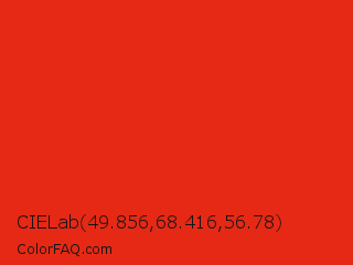 CIELab 49.856,68.416,56.78 Color is a normal red color and the nearest color is Lust #e62020. Hex code #e52915 and RGB value is rgb(229,41,21). In RGB color space, this color is composed of 90% red, 16% green, 8% blue, In CMYK color space, this color is composed of 0% cyan, 82% magenta, 91% yellow , 10% black , In HSL color space, this color has a hue angle of 6° , 83% saturation and 49% lightness.