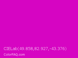 CIELab 49.858,82.927,-43.376 Color is a normal magenta color and the nearest color is Deep Magenta #cc00cc. Hex code #d605c2 and RGB value is rgb(214,5,194). In RGB color space, this color is composed of 84% red, 2% green, 76% blue, In CMYK color space, this color is composed of 0% cyan, 98% magenta, 9% yellow , 16% black , In HSL color space, this color has a hue angle of 306° , 95% saturation and 43% lightness.
