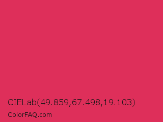 CIELab 49.859,67.498,19.103 Color is a normal red color and the nearest color is Cerise Red #de3163. Hex code #de2f5a and RGB value is rgb(222,47,90). In RGB color space, this color is composed of 87% red, 18% green, 35% blue, In CMYK color space, this color is composed of 0% cyan, 79% magenta, 59% yellow , 13% black , In HSL color space, this color has a hue angle of 345° , 73% saturation and 53% lightness.