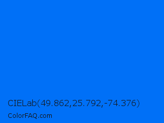 CIELab 49.862,25.792,-74.376 Color is a normal blue color and the nearest color is Brandeis Blue #0070ff. Hex code #0070f7 and RGB value is rgb(0,112,247). In RGB color space, this color is composed of 0% red, 44% green, 97% blue, In CMYK color space, this color is composed of 100% cyan, 55% magenta, 0% yellow , 3% black , In HSL color space, this color has a hue angle of 213° , 100% saturation and 48% lightness.