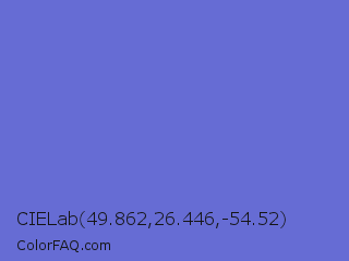 CIELab 49.862,26.446,-54.52 Color is a light blue color and the nearest color is Slate Blue #6a5acd. Hex code #666cd4 and RGB value is rgb(102,108,212). In RGB color space, this color is composed of 40% red, 42% green, 83% blue, In CMYK color space, this color is composed of 52% cyan, 49% magenta, 0% yellow , 17% black , In HSL color space, this color has a hue angle of 237° , 56% saturation and 62% lightness.
