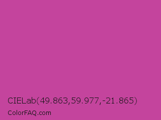 CIELab 49.863,59.977,-21.865 Color is a normal magenta color and the nearest color is Mulberry #c54b8c. Hex code #c4449d and RGB value is rgb(196,68,157). In RGB color space, this color is composed of 77% red, 27% green, 62% blue, In CMYK color space, this color is composed of 0% cyan, 65% magenta, 20% yellow , 23% black , In HSL color space, this color has a hue angle of 318° , 52% saturation and 52% lightness.