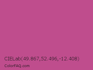 CIELab 49.867,52.496,-12.408 Color is a normal magenta color and the nearest color is Mulberry #c54b8c. Hex code #bf4d8d and RGB value is rgb(191,77,141). In RGB color space, this color is composed of 75% red, 30% green, 55% blue, In CMYK color space, this color is composed of 0% cyan, 60% magenta, 26% yellow , 25% black , In HSL color space, this color has a hue angle of 326° , 47% saturation and 53% lightness.