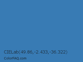 CIELab 49.86,-2.433,-36.322 Color is a normal blue color and the nearest color is Steel Blue #4682b4. Hex code #387bb4 and RGB value is rgb(56,123,180). In RGB color space, this color is composed of 22% red, 48% green, 71% blue, In CMYK color space, this color is composed of 69% cyan, 32% magenta, 0% yellow , 29% black , In HSL color space, this color has a hue angle of 208° , 53% saturation and 46% lightness.