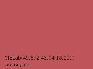CIELab 49.872,43.04,18.201 Color is a normal red color and the nearest color is Fuzzy Wuzzy Brown #c45655. Hex code #bf555a and RGB value is rgb(191,85,90). In RGB color space, this color is composed of 75% red, 33% green, 35% blue, In CMYK color space, this color is composed of 0% cyan, 55% magenta, 53% yellow , 25% black , In HSL color space, this color has a hue angle of 357° , 45% saturation and 54% lightness.