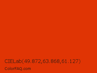 CIELab 49.872,63.868,61.127 Color is a normal red color and the nearest color is Grenadier #d54600. Hex code #e03404 and RGB value is rgb(224,52,4). In RGB color space, this color is composed of 88% red, 20% green, 2% blue, In CMYK color space, this color is composed of 0% cyan, 77% magenta, 98% yellow , 12% black , In HSL color space, this color has a hue angle of 13° , 96% saturation and 45% lightness.