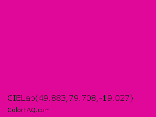 CIELab 49.883,79.708,-19.027 Color is a normal magenta color and the nearest color is Hollywood Cerise #f400a1. Hex code #e00899 and RGB value is rgb(224,8,153). In RGB color space, this color is composed of 88% red, 3% green, 60% blue, In CMYK color space, this color is composed of 0% cyan, 96% magenta, 32% yellow , 12% black , In HSL color space, this color has a hue angle of 320° , 93% saturation and 45% lightness.