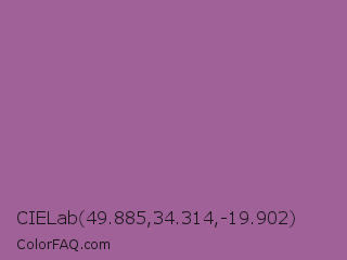 CIELab 49.885,34.314,-19.902 Color is a normal magenta color and the nearest color is Trendy Pink #8c6495. Hex code #a06199 and RGB value is rgb(160,97,153). In RGB color space, this color is composed of 63% red, 38% green, 60% blue, In CMYK color space, this color is composed of 0% cyan, 39% magenta, 4% yellow , 37% black , In HSL color space, this color has a hue angle of 307° , 25% saturation and 50% lightness.