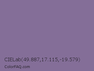 CIELab 49.887,17.115,-19.579 Color is a normal purple color and the nearest color is Trendy Pink #8c6495. Hex code #846e98 and RGB value is rgb(132,110,152). In RGB color space, this color is composed of 52% red, 43% green, 60% blue, In CMYK color space, this color is composed of 13% cyan, 28% magenta, 0% yellow , 40% black , In HSL color space, this color has a hue angle of 271° , 17% saturation and 51% lightness.