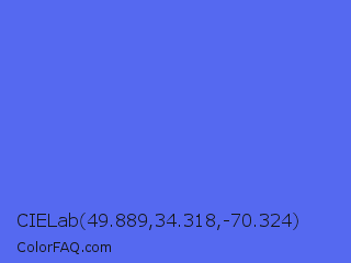 CIELab 49.889,34.318,-70.324 Color is a light blue color and the nearest color is Ultramarine Blue #4166f5. Hex code #5569f0 and RGB value is rgb(85,105,240). In RGB color space, this color is composed of 33% red, 41% green, 94% blue, In CMYK color space, this color is composed of 65% cyan, 56% magenta, 0% yellow , 6% black , In HSL color space, this color has a hue angle of 232° , 84% saturation and 64% lightness.