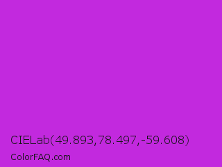 CIELab 49.893,78.497,-59.608 Color is a normal purple color and the nearest color is Steel Pink #cc33cc. Hex code #c229de and RGB value is rgb(194,41,222). In RGB color space, this color is composed of 76% red, 16% green, 87% blue, In CMYK color space, this color is composed of 13% cyan, 82% magenta, 0% yellow , 13% black , In HSL color space, this color has a hue angle of 291° , 73% saturation and 52% lightness.