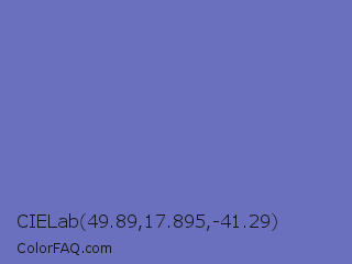 CIELab 49.89,17.895,-41.29 Color is a normal blue color and the nearest color is Toolbox #746cc0. Hex code #6a70bd and RGB value is rgb(106,112,189). In RGB color space, this color is composed of 42% red, 44% green, 74% blue, In CMYK color space, this color is composed of 44% cyan, 41% magenta, 0% yellow , 26% black , In HSL color space, this color has a hue angle of 236° , 39% saturation and 58% lightness.