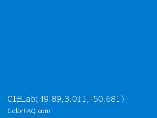 CIELab 49.89,3.011,-50.681 Color is a normal blue color and the nearest color is Lochmara #007ec7. Hex code #007acd and RGB value is rgb(0,122,205). In RGB color space, this color is composed of 0% red, 48% green, 80% blue, In CMYK color space, this color is composed of 100% cyan, 40% magenta, 0% yellow , 20% black , In HSL color space, this color has a hue angle of 204° , 100% saturation and 40% lightness.