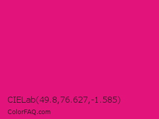 CIELab 49.8,76.627,-1.585 Color is a normal rose color and the nearest color is Vivid Cerise #da1d81. Hex code #e3137c and RGB value is rgb(227,19,124). In RGB color space, this color is composed of 89% red, 7% green, 49% blue, In CMYK color space, this color is composed of 0% cyan, 92% magenta, 45% yellow , 11% black , In HSL color space, this color has a hue angle of 330° , 85% saturation and 48% lightness.
