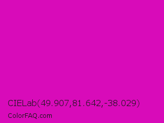CIELab 49.907,81.642,-38.029 Color is a normal magenta color and the nearest color is Deep Magenta #cc00cc. Hex code #d80bb9 and RGB value is rgb(216,11,185). In RGB color space, this color is composed of 85% red, 4% green, 73% blue, In CMYK color space, this color is composed of 0% cyan, 95% magenta, 14% yellow , 15% black , In HSL color space, this color has a hue angle of 309° , 90% saturation and 45% lightness.