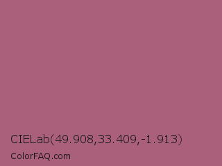 CIELab 49.908,33.409,-1.913 Color is a normal rose color and the nearest color is Tapestry #b05e81. Hex code #aa607b and RGB value is rgb(170,96,123). In RGB color space, this color is composed of 67% red, 38% green, 48% blue, In CMYK color space, this color is composed of 0% cyan, 44% magenta, 28% yellow , 33% black , In HSL color space, this color has a hue angle of 338° , 30% saturation and 52% lightness.