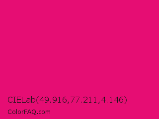 CIELab 49.916,77.211,4.146 Color is a normal rose color and the nearest color is Red Purple #e40078. Hex code #e60d73 and RGB value is rgb(230,13,115). In RGB color space, this color is composed of 90% red, 5% green, 45% blue, In CMYK color space, this color is composed of 0% cyan, 94% magenta, 50% yellow , 10% black , In HSL color space, this color has a hue angle of 332° , 89% saturation and 48% lightness.