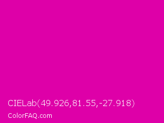 CIELab 49.926,81.55,-27.918 Color is a normal magenta color and the nearest color is Hollywood Cerise #f400a1. Hex code #de00a8 and RGB value is rgb(222,0,168). In RGB color space, this color is composed of 87% red, 0% green, 66% blue, In CMYK color space, this color is composed of 0% cyan, 100% magenta, 24% yellow , 13% black , In HSL color space, this color has a hue angle of 315° , 100% saturation and 44% lightness.