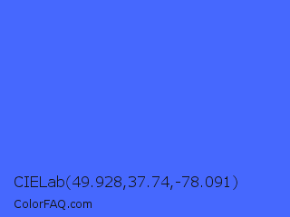 CIELab 49.928,37.74,-78.091 Color is a light blue color and the nearest color is Ultramarine Blue #4166f5. Hex code #4668fe and RGB value is rgb(70,104,254). In RGB color space, this color is composed of 27% red, 41% green, 100% blue, In CMYK color space, this color is composed of 72% cyan, 59% magenta, 0% yellow , 0% black , In HSL color space, this color has a hue angle of 229° , 99% saturation and 64% lightness.