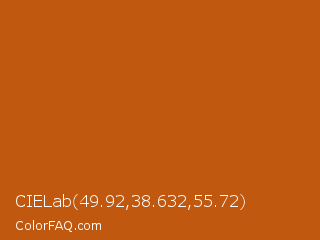 CIELab 49.92,38.632,55.72 Color is a normal orange color and the nearest color is Orange Roughy #c45719. Hex code #c1580f and RGB value is rgb(193,88,15). In RGB color space, this color is composed of 76% red, 35% green, 6% blue, In CMYK color space, this color is composed of 0% cyan, 54% magenta, 92% yellow , 24% black , In HSL color space, this color has a hue angle of 25° , 86% saturation and 41% lightness.
