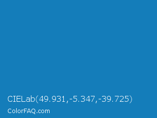 CIELab 49.931,-5.347,-39.725 Color is a normal blue color and the nearest color is Cyan Cornflower Blue #188bc2. Hex code #147dba and RGB value is rgb(20,125,186). In RGB color space, this color is composed of 8% red, 49% green, 73% blue, In CMYK color space, this color is composed of 89% cyan, 33% magenta, 0% yellow , 27% black , In HSL color space, this color has a hue angle of 202° , 81% saturation and 40% lightness.